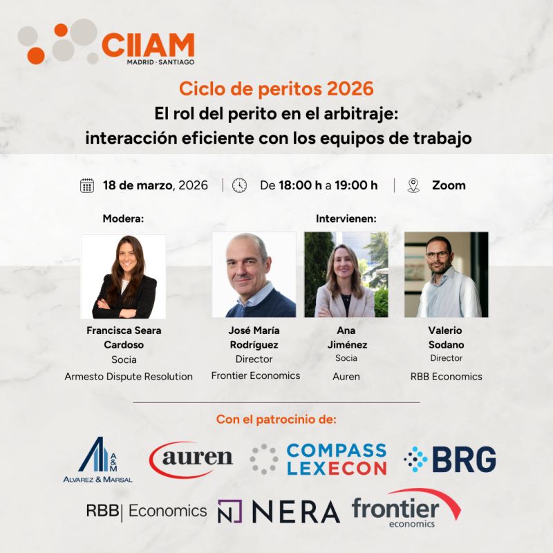 La primera sesión del ciclo tendrá lugar el próximo miércoles 18 de marzo de 2026 a las 18:00 (hora de Madrid) y se celebrará en formato online a través de Zoom. Bajo el título “Rol del perito en el arbitraje: interacción eficiente con los equipos de trabajo”, el webinar abordará la importancia de la coordinación entre peritos, abogados y demás profesionales implicados en los procedimientos arbitrales.
